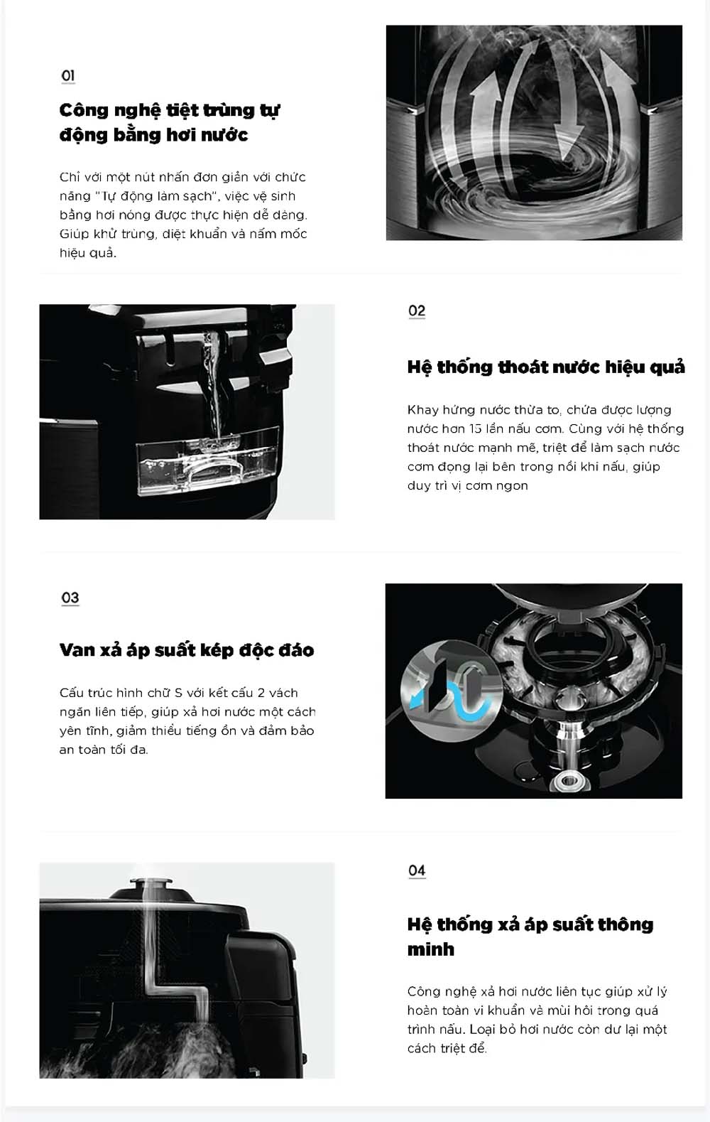 - Hệ thống xả áp suất thông minh: Công nghệ xả hơi nước liên tục giúp xử lý hoàn toàn vi khuẩn và mùi hôi trong quá trình nấu, đồng thời đảm bảo an toàn.