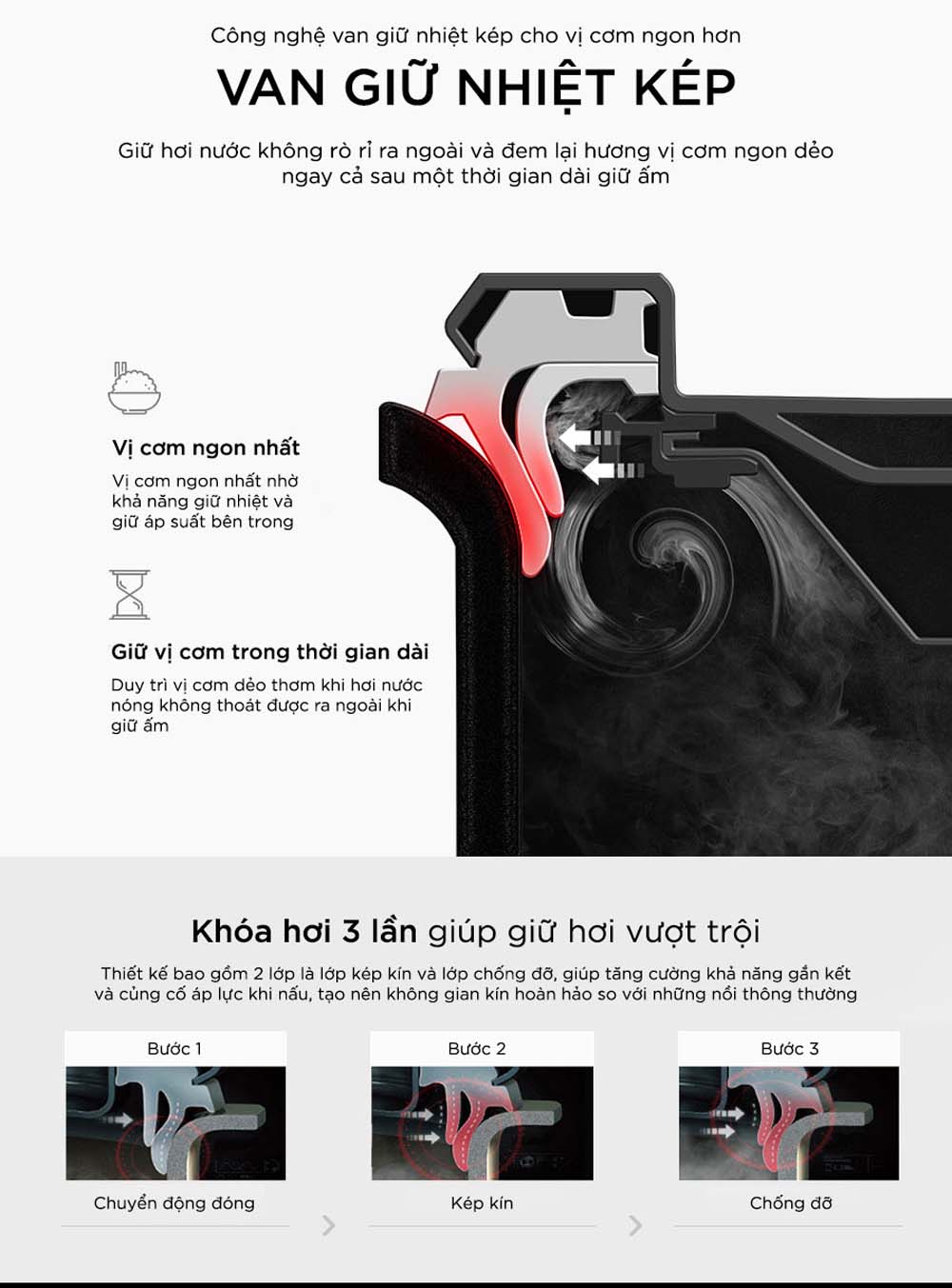 - Hệ thống xả áp suất thông minh: Công nghệ xả hơi nước liên tục giúp xử lý hoàn toàn vi khuẩn và mùi hôi trong quá trình nấu, đồng thời đảm bảo an toàn.