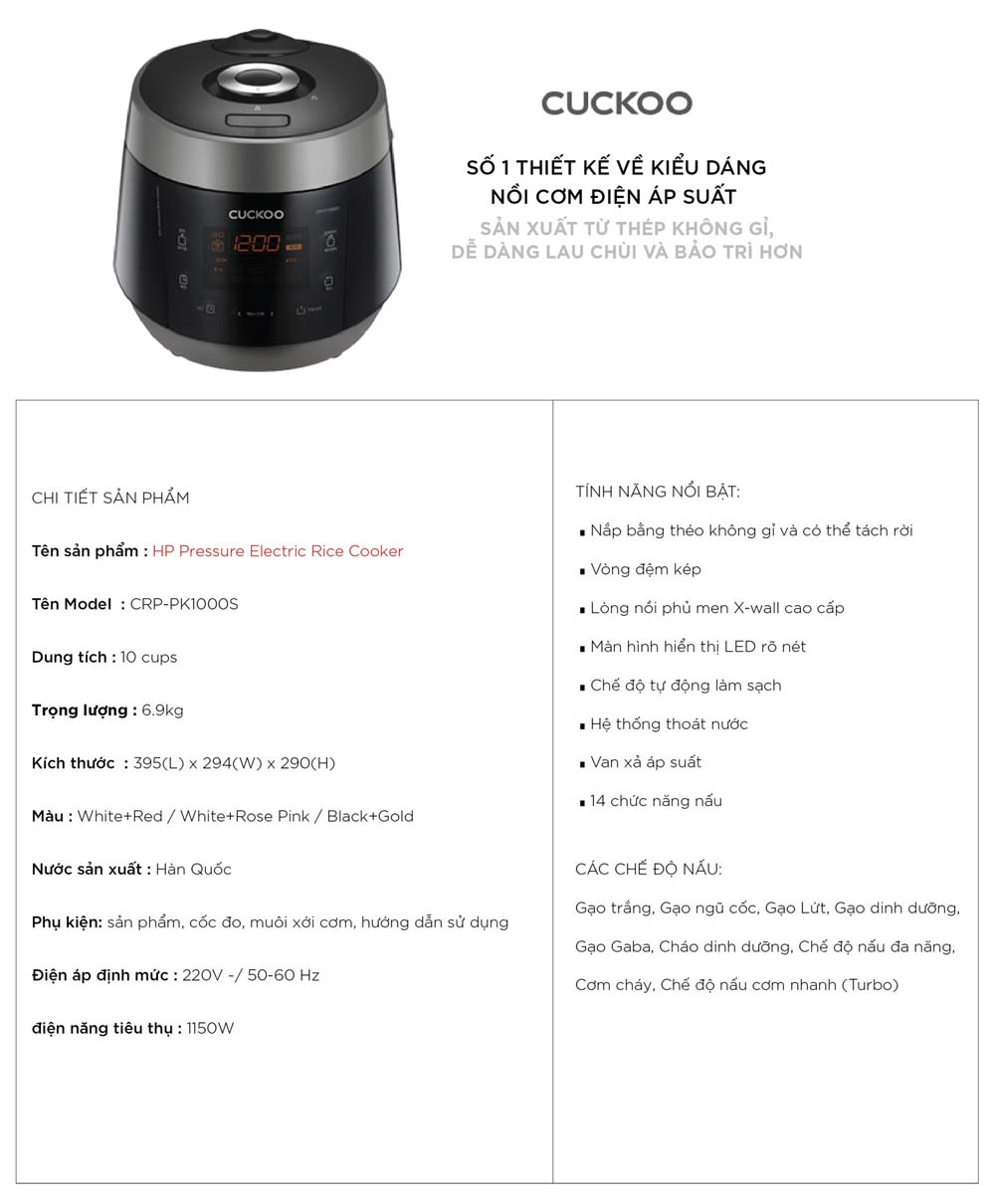 Thông số kỹ thuật Nồi cơm điện tử CUCKOO CRP-PK1000S P2PIVNCV 1.8L áp suất