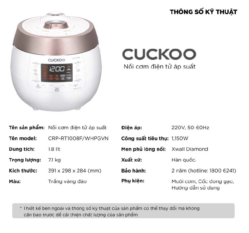 Thông số kỹ thuật Nồi cơm điện tử CUCKOO CRP-RT1008F WHPGVN 1.8L áp suất kép