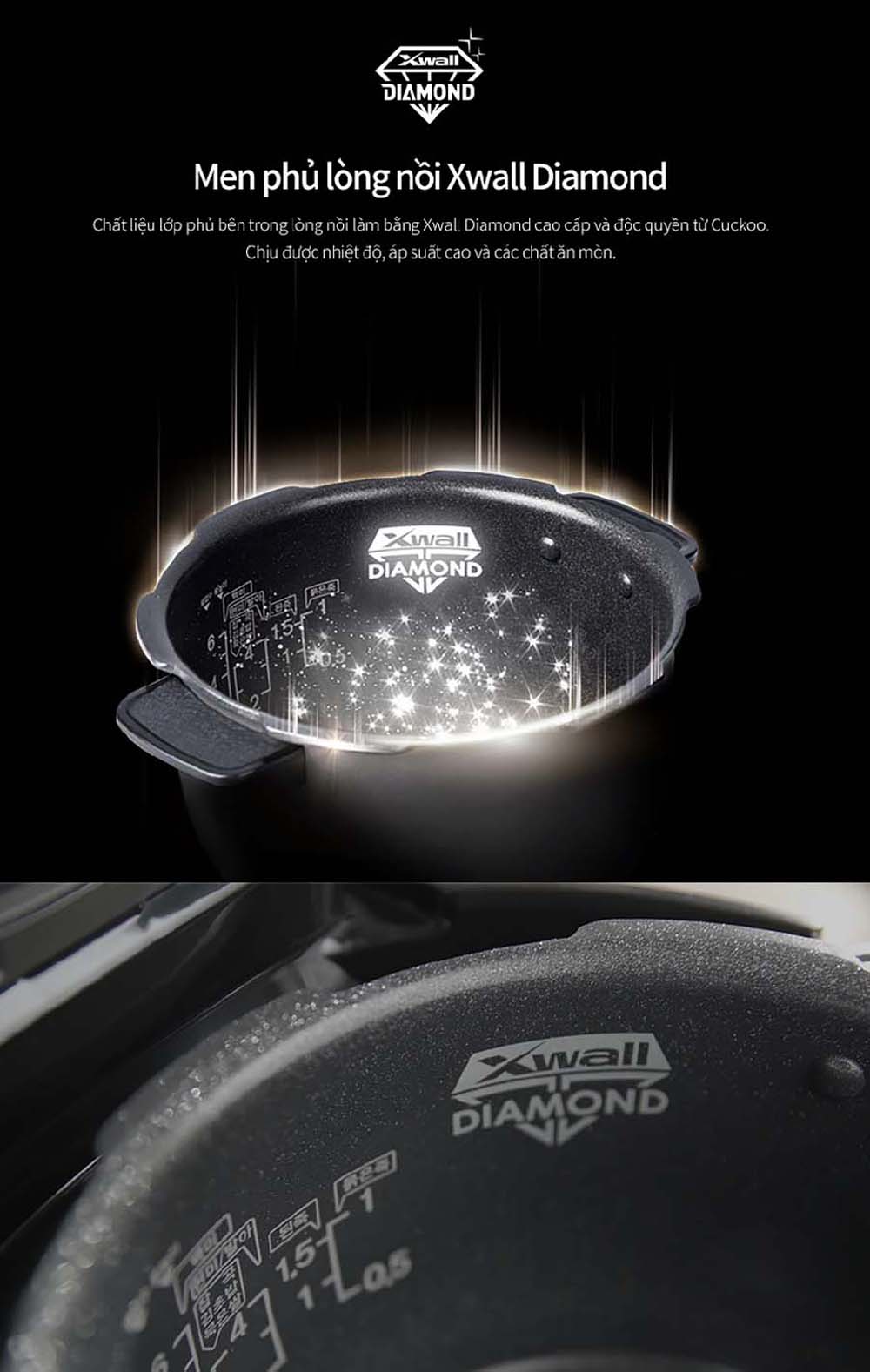 - Lòng nồi phủ men X-Wall Diamond cao cấp: Men chống dính hiệu quả và an toàn cho sức khỏe. Có khả năng chịu nhiệt và áp suất cực cao, đảm bảo độ bền và hiệu suất cao.