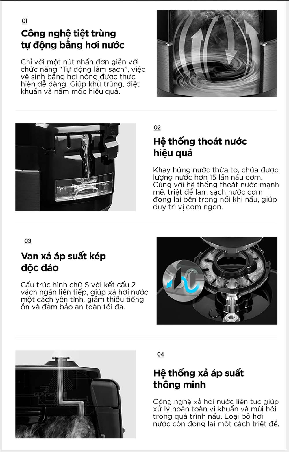 - Van xả áp thoát hơi êm ái và hệ thống xả nước hiệu quả: Thiết kế để hoạt động êm ái và hiệu quả, giúp bảo vệ thiết bị và đảm bảo an toàn sử dụng.