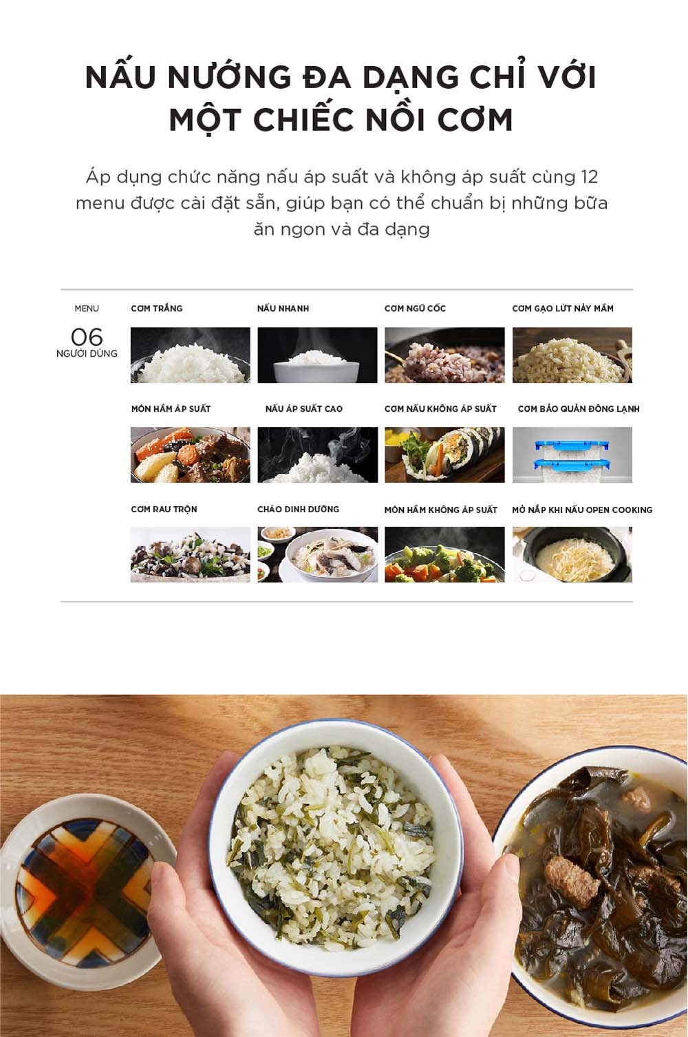 - Giữ ấm, hâm nóng với công nghệ giữ nhiệt đa chiều: Duy trì hơi ấm và nhiệt độ đồng đều, giữ cơm và thực phẩm ấm ngon trong thời gian dài sau khi kết thúc quá trình nấu.
