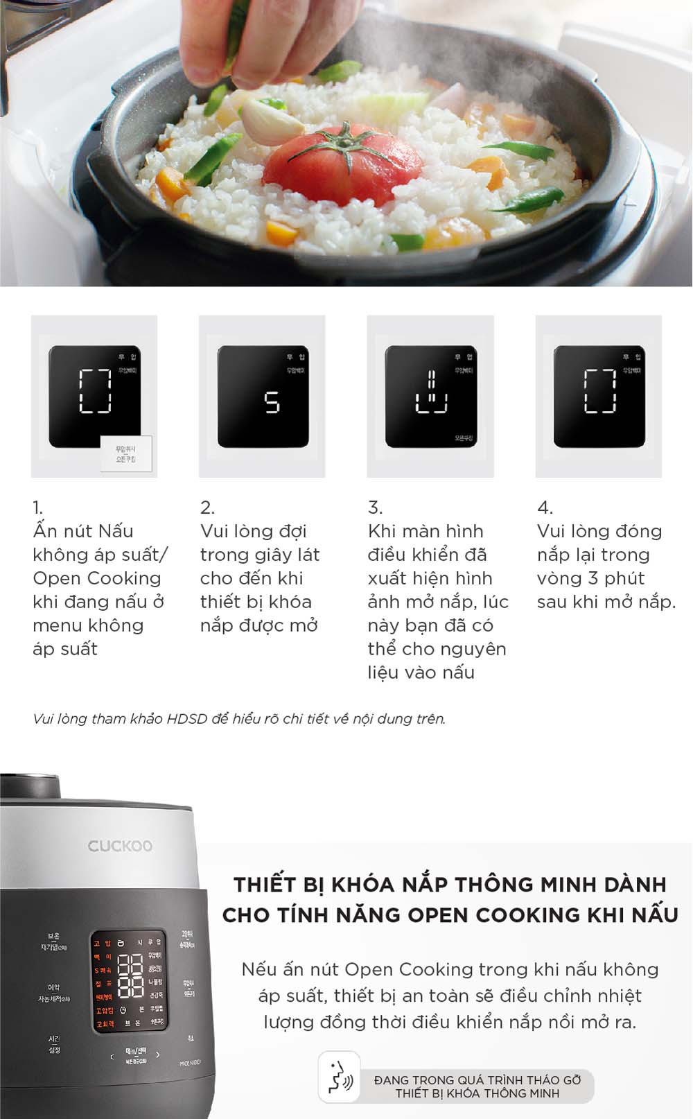 - Chế độ nấu ăn mở nắp tiện lợi: Cho phép kiểm soát và thêm thực phẩm dễ dàng trong quá trình nấu.