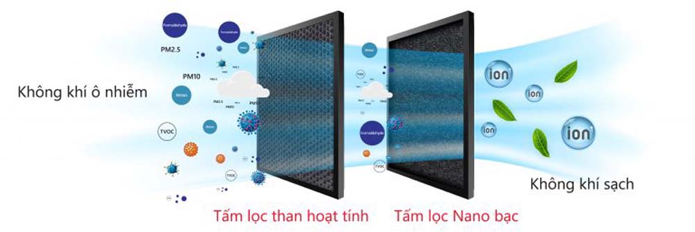 - Hệ Thống Lọc Không Khí: Tấm lọc tích hợp gồm lớp lọc than hoạt tính và lớp lọc Nano bạc giúp loại bỏ mùi, bụi, vi khuẩn, và nấm mốc, đảm bảo không khí sạch sẽ.