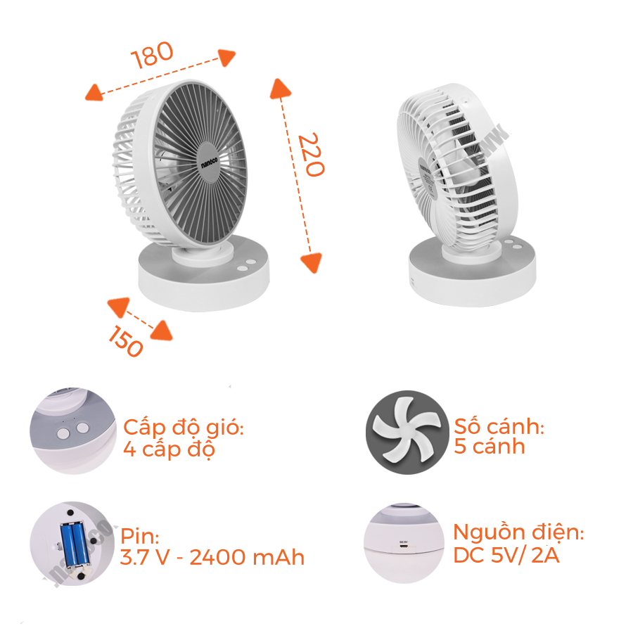 Tính năng Quạt sạc NANOCO NRF6215W trắng