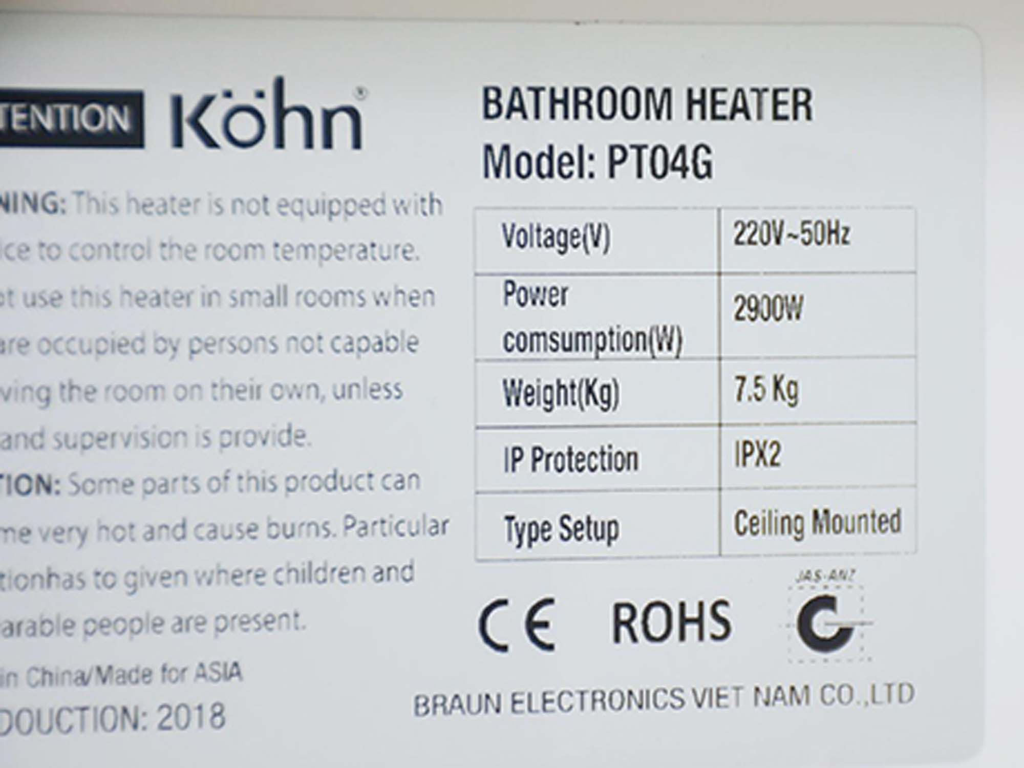 Thông số kỹ thuật Quạt sưởi nhà tắm KOHN PT02G âm trần đa năng