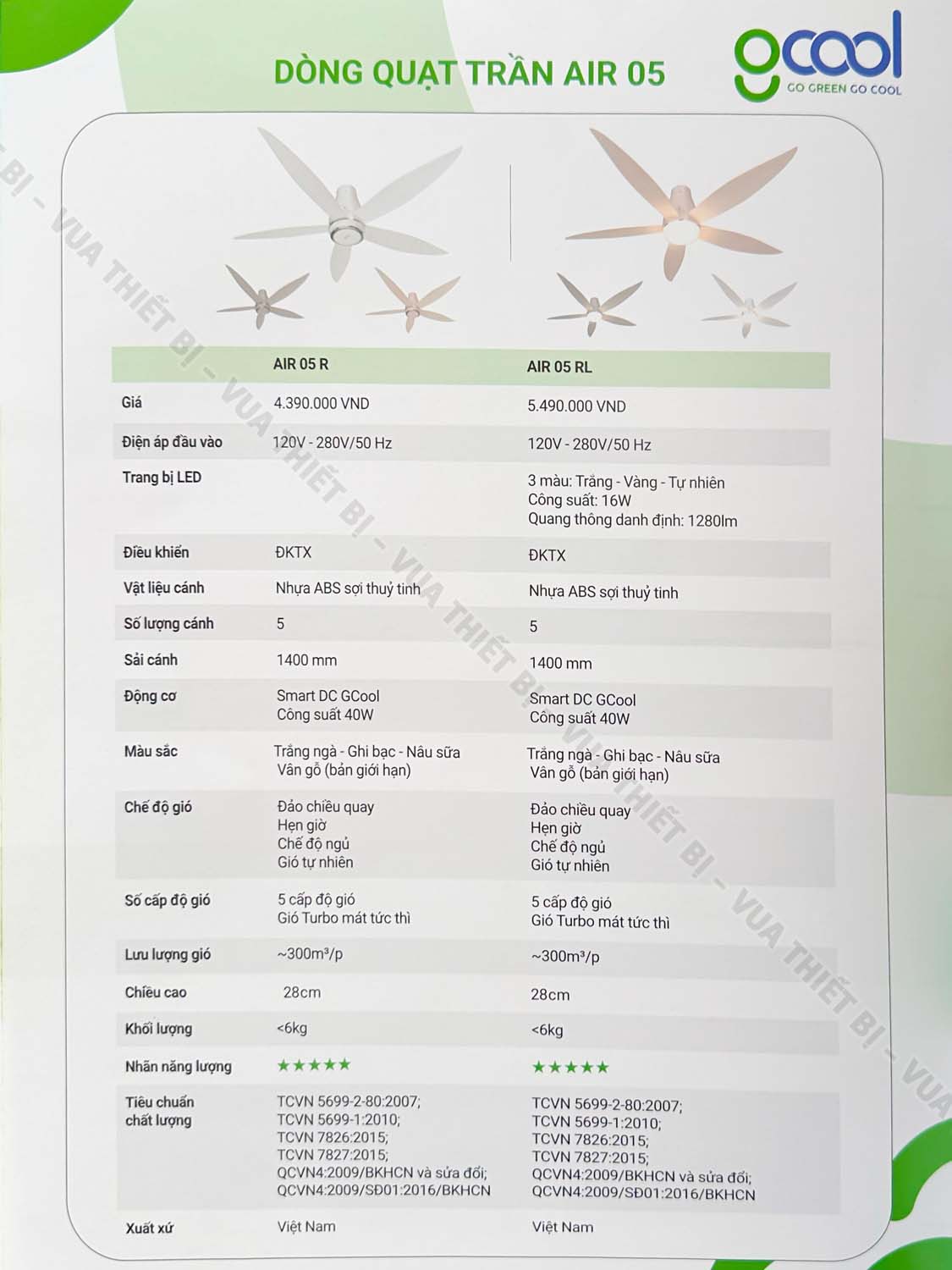 Thông số kỹ thuật Quạt trần GCOOL AIR 05 R 5 cánh