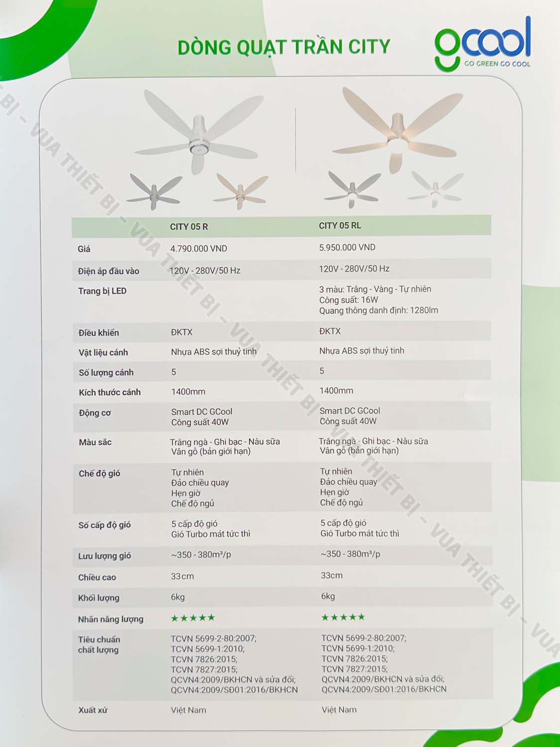 Thông số kỹ thuật Quạt trần GCOOL CITY 05 RL 5 cánh