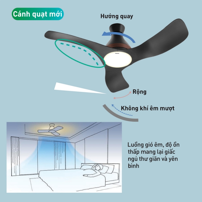 - Thiết kế cánh quạt 3D: Tạo luồng gió mạnh mẽ và êm ái, cánh quạt làm từ vật liệu PPG bền bỉ.