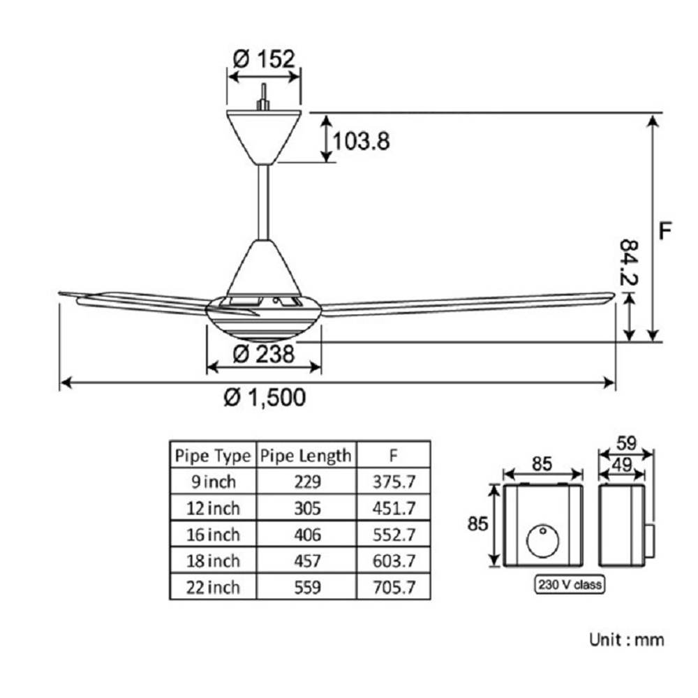 Thông số kỹ thuật Quạt trần Panasonic F-60MZ2-MS 3 cánh Trắng hộp số
