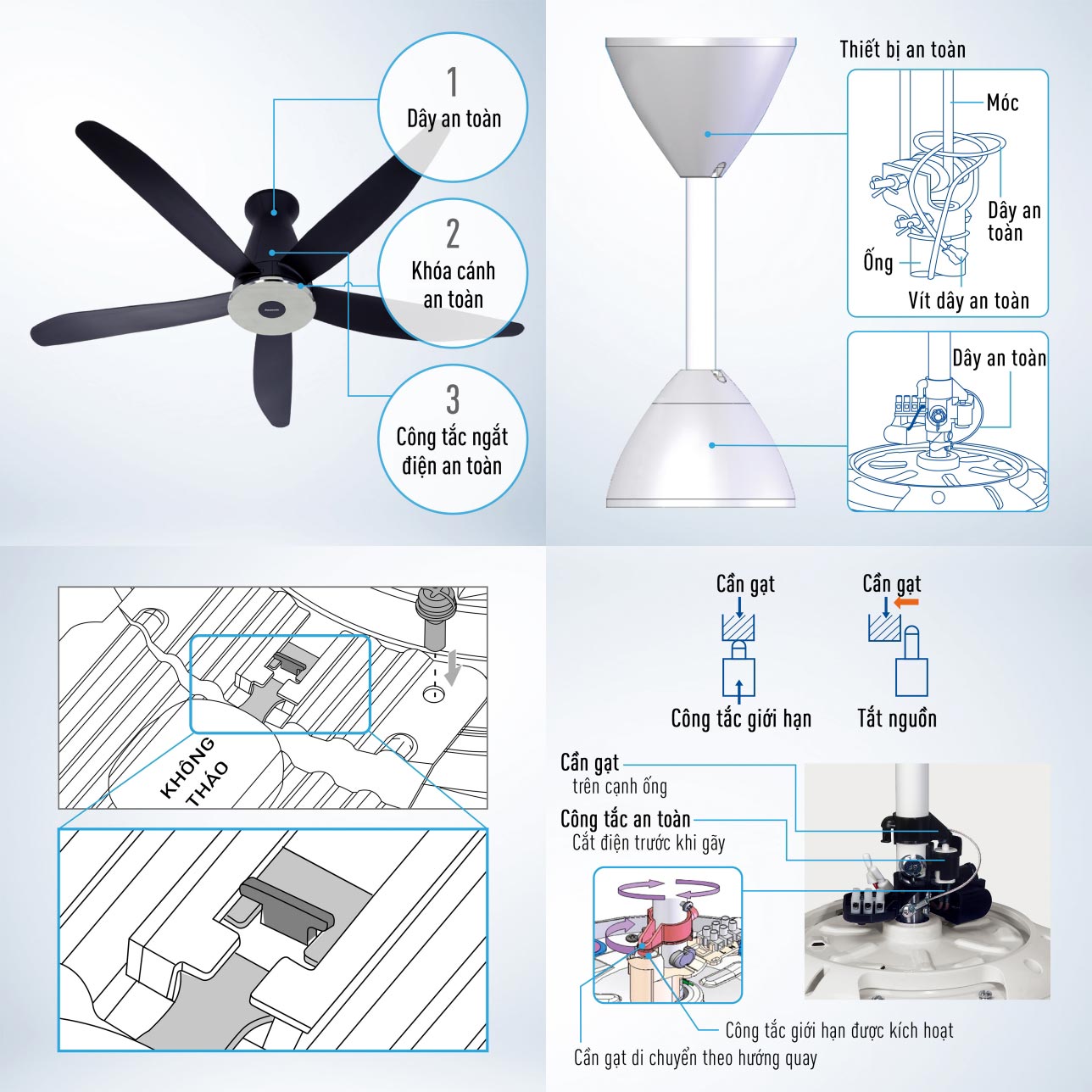 - 3 cấp độ an toàn: khóa cánh an toàn, dây an toàn, công tắc an toàn