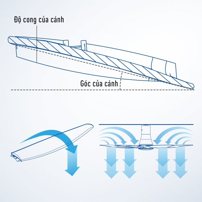 - Cánh quạt sử dụng chất liệu PPG độ bền cao kết hợp với thiết kế 3D cho luồng gió mạnh, êm