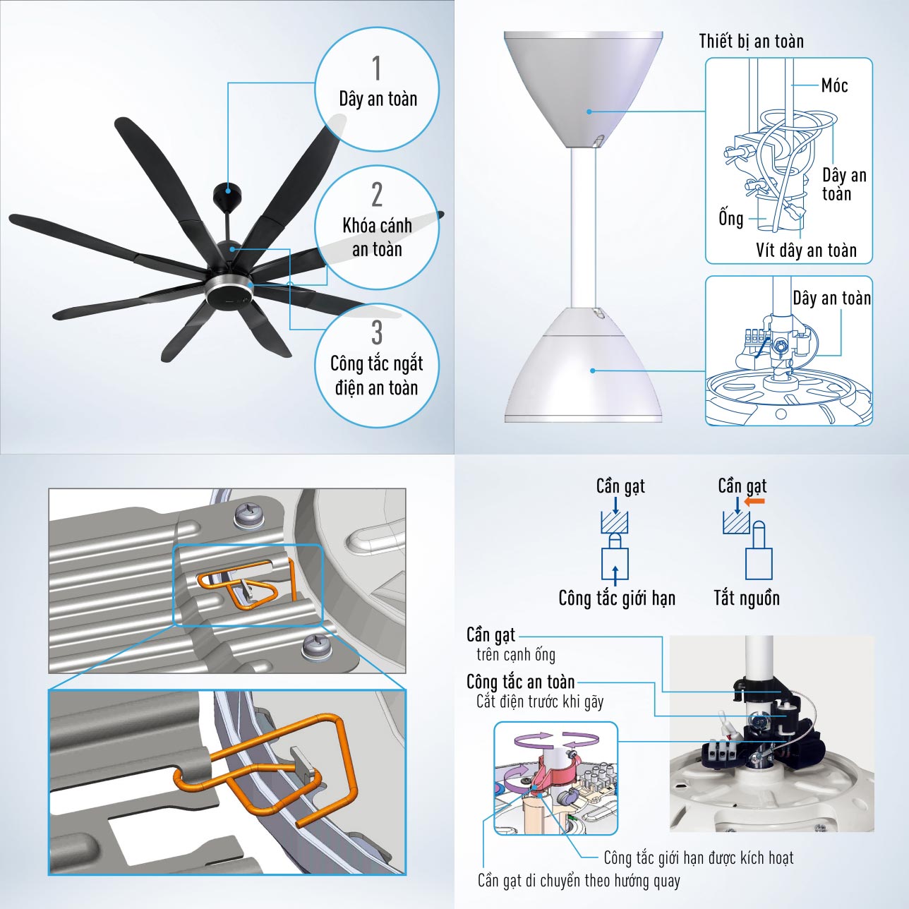 - 3 cấp độ an toàn: khóa cánh an toàn, dây an toàn, công tắc an toàn