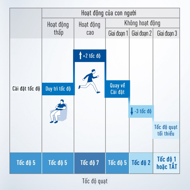 - Cảm biến nhận diện chuyển động con người: tự động điều chỉnh công suất theo lượng người trong phòng giúp tiết kiệm điện tối đa