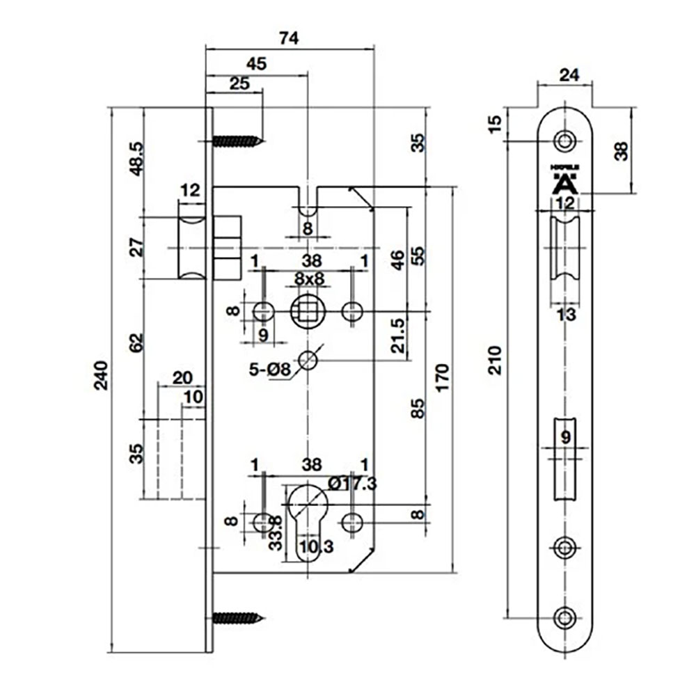 - Khoảng cách từ cạnh cửa đến tâm lỗ ruột khóa (a): 45 mm