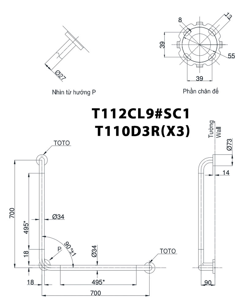 Thông số kĩ thuật Thanh vịn TOTO T112CL9#SC1 T110D3R(X3) gắn tường