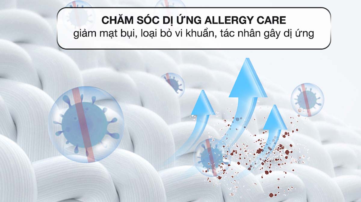 Chế độ giặt hơi nước Allergy Care giúp loại bỏ các tác nhân gây dị ứng như mạt bụi, bảo vệ sức khỏe cho gia đình, đặc biệt là trẻ nhỏ và người nhạy cảm.
