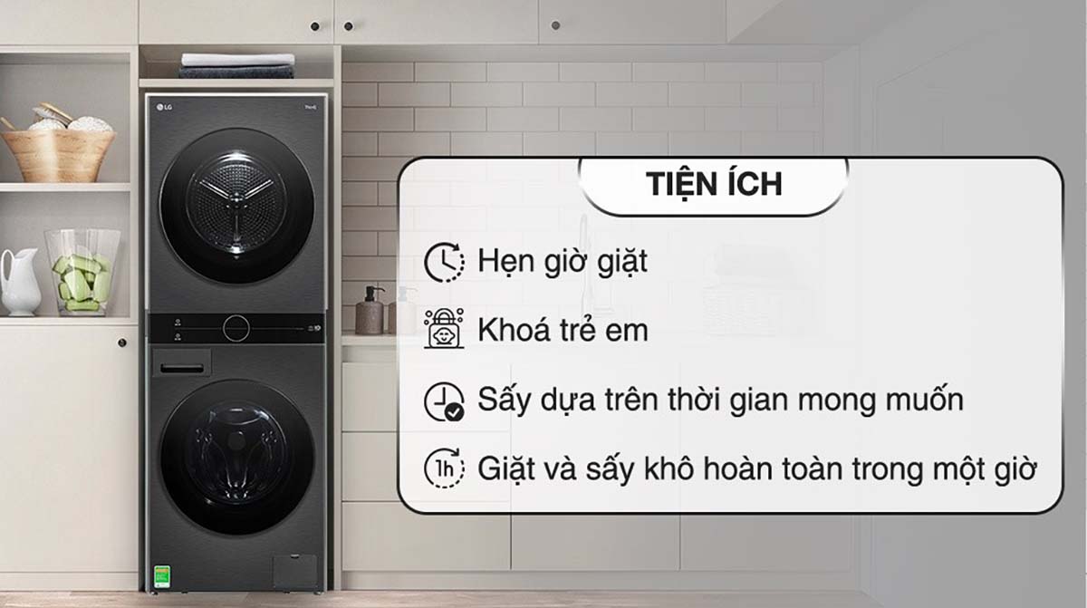 Máy giặt sấy LG WashTower™ WT2116SHB được trang bị tính năng hẹn giờ, cho phép người dùng cài đặt thời gian bắt đầu hoặc kết thúc chu trình giặt/sấy theo nhu cầu. Ngoài ra, chức năng khóa trẻ em giúp ngăn ngừa trẻ nhỏ vô tình thay đổi cài đặt hoặc mở cửa máy trong quá trình hoạt động, đảm bảo an toàn cho gia đình.