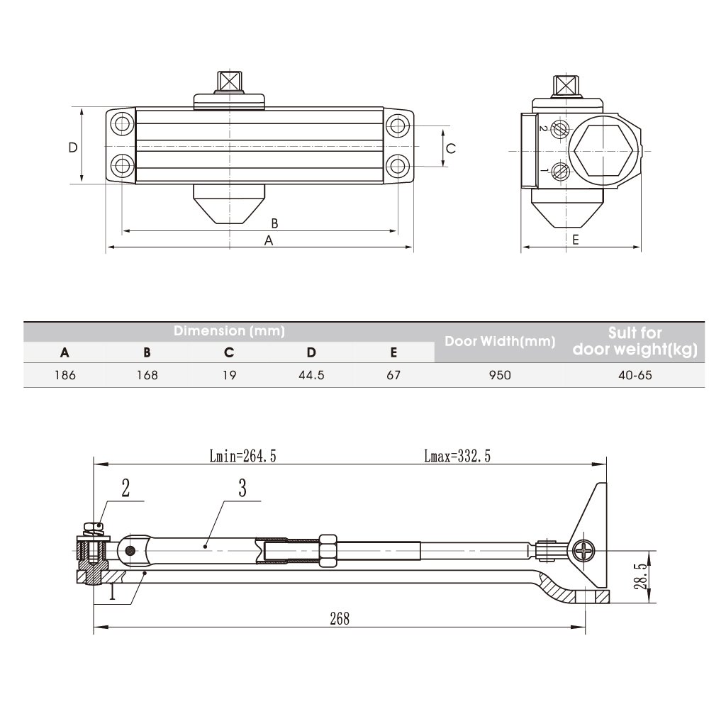 - Lực đẩy EN3: Thiết bị cung cấp lực đẩy EN3, phù hợp cho các loại cửa có kích thước và trọng lượng trong khoảng được đề xuất.