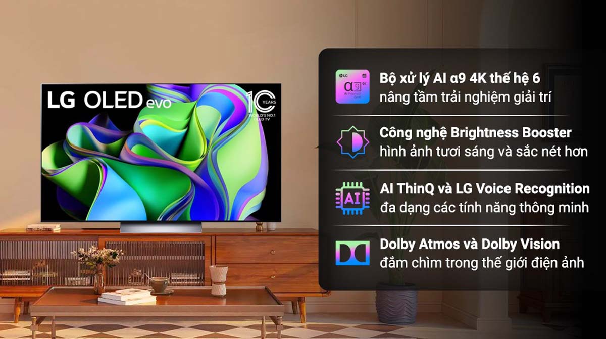 LG 55C3PSA hỗ trợ chuẩn hình ảnh Dolby Vision cho màu sắc sống động, chi tiết tinh tế và độ sáng chính xác. Kết hợp cùng Dolby Atmos, LG 55C3PSA mang đến âm thanh vòm ba chiều mạnh mẽ và chân thực, giúp người dùng đắm chìm trong không gian giải trí sống động như rạp phim tại nhà.Tinh nang Tivi LG 55C3PSA 55 inch 4K OLED Smart 3