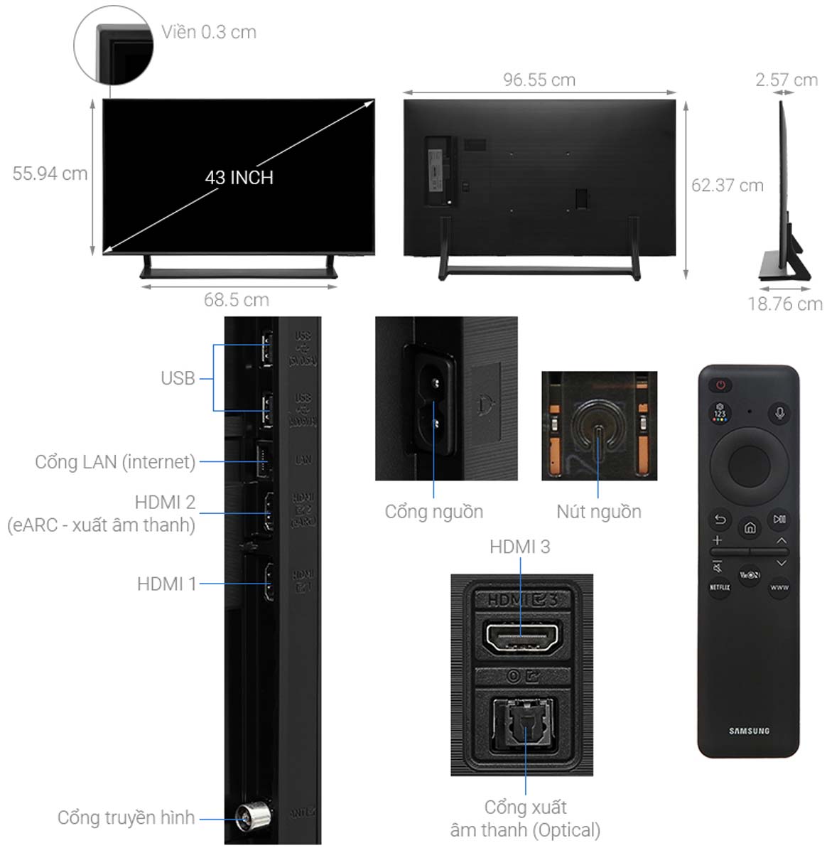 | Kích thước không chân, treo tường | 965.5 x 559.4 x 25.7 mm (RxCxD) |