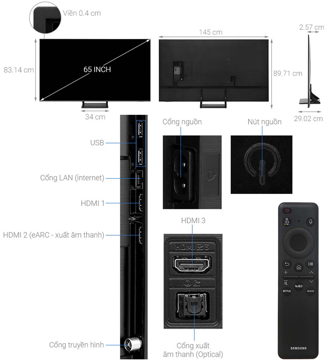 | Kích thước không chân, treo tường | 1450.9 x 831.4 x 25.7 mm (RxCxD) |
