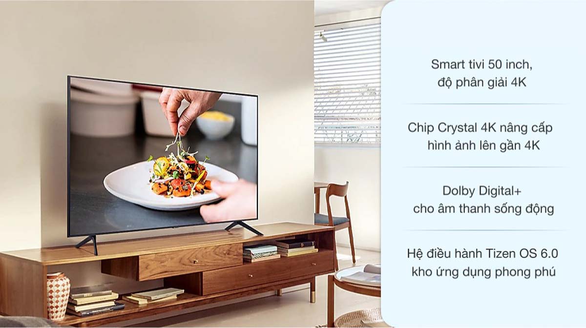 UA50AU7700KXXV chạy trên nền tảng Tizen OS – hệ điều hành độc quyền của Samsung với giao diện trực quan, thao tác dễ dàng. Kho ứng dụng phong phú như Netflix, YouTube, FPT Play, VieON,… giúp người dùng truy cập nhanh vào các nội dung giải trí yêu thích.