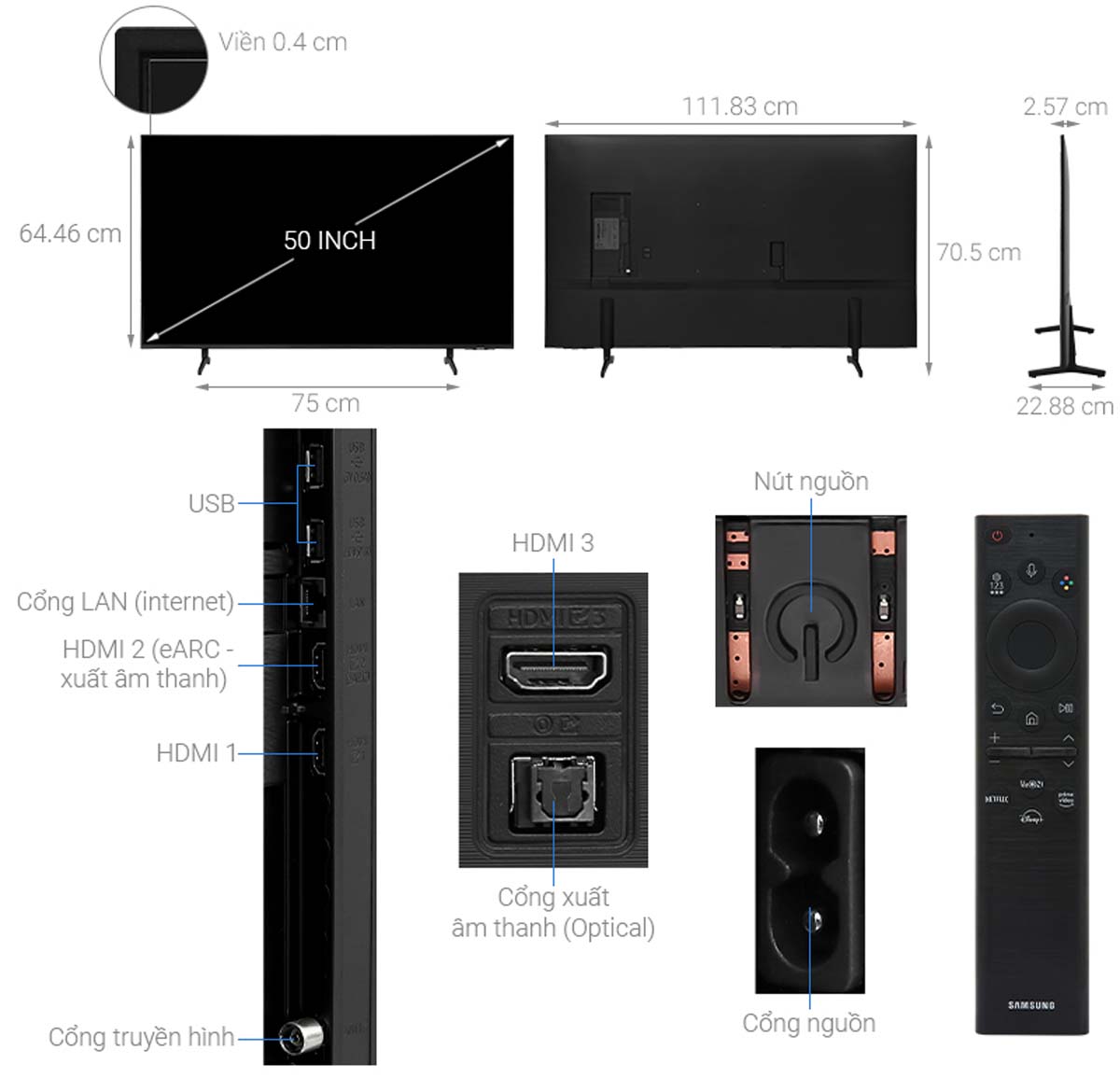 | Kích thước không chân đế | 1118.3 x 644.6 x 25.7 mm (WxHxD) |