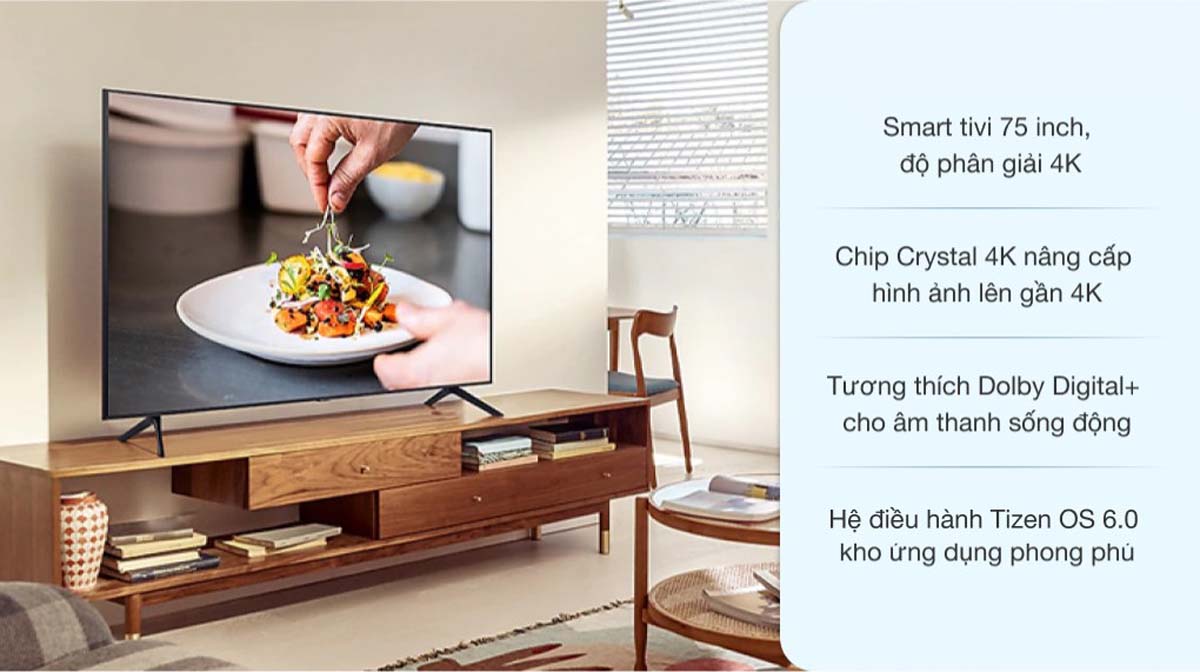 UA75AU7700KXXV sử dụng hệ điều hành Tizen OS thân thiện với người dùng, cho phép truy cập nhanh chóng vào các ứng dụng phổ biến như YouTube, Netflix, FPT Play, VieON,… Giao diện trực quan giúp thao tác dễ dàng và tận hưởng nội dung giải trí nhanh chóng.