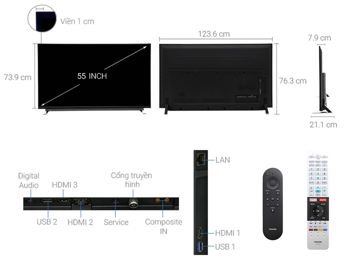 Tivi Toshiba 55U7750VN gây ấn tượng với thiết kế viền siêu mỏng ba cạnh, tạo hiệu ứng hình ảnh tràn viền tinh tế và hiện đại. Kích thước lớn 55 inch phù hợp với các không gian rộng như phòng khách, phòng họp hoặc khu vực giải trí cao cấp. Toshiba 55U7750VN không chỉ là một thiết bị nghe nhìn mà còn là điểm nhấn nội thất đẳng cấp.