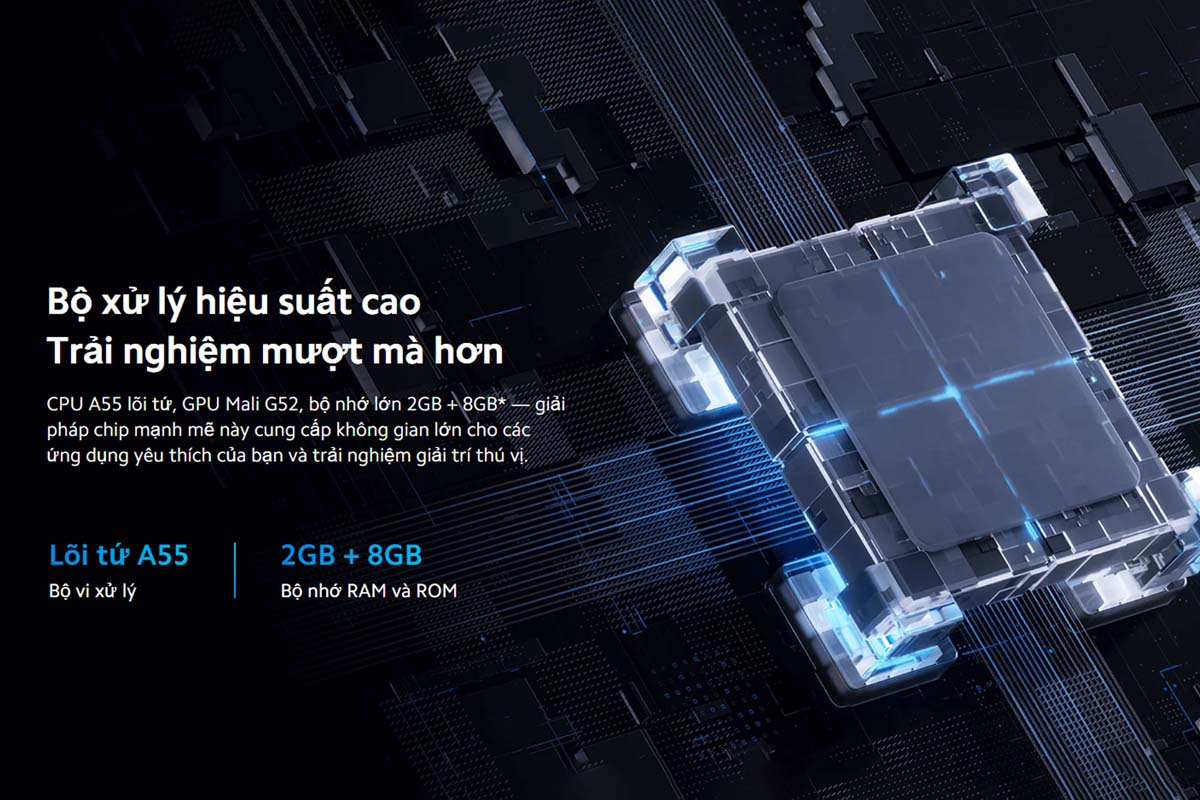 XIAOMI A Pro 50 2025 sử dụng chip CPU A55 lõi tứ cùng GPU Mali G52 và bộ nhớ RAM 2GB + ROM 8GB giúp xử lý nhanh và vận hành ổn định. Bạn có thể tải và mở ứng dụng, xem nội dung đa phương tiện hoặc chơi game mượt mà. Cấu hình mạnh mẽ của XIAOMI A Pro 50 2025 giúp nâng cao hiệu suất tổng thể và kéo dài tuổi thọ sản phẩm.