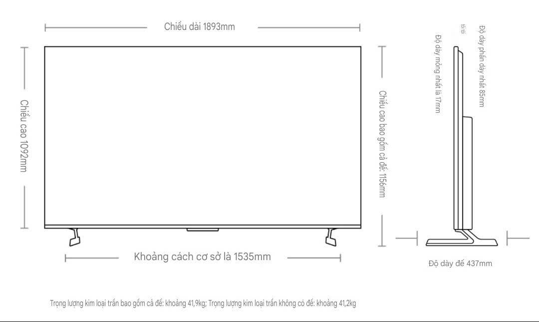 - Kích thước (không chân đế): 1890 × 94.3 × 1087.3 mm