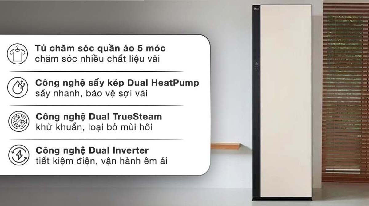 - Công nghệ & Tiện ích: DUAL TrueSteam™, Dynamic MovingHanger™, Built-in HandySteamer™, EZ Fit PantsPress™, AutoFresh System™, Điều khiển từ xa qua ứng dụng ThinQ™ (Wi-Fi), Màn hình cảm ứng LCD thông minh, Không cần lắp đặt ống nước, Hút ẩm không khí