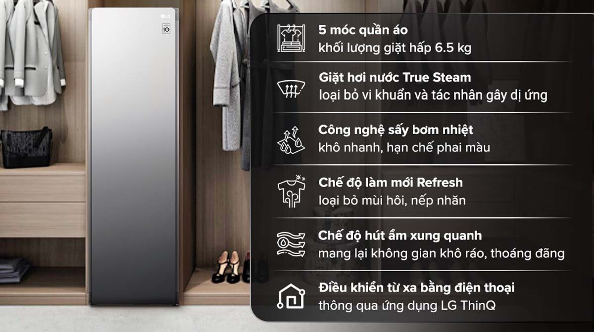 Ngoài việc chăm sóc quần áo, LG Styler còn có khả năng hút ẩm không khí xung quanh, giúp duy trì môi trường khô ráo và thoải mái trong phòng.