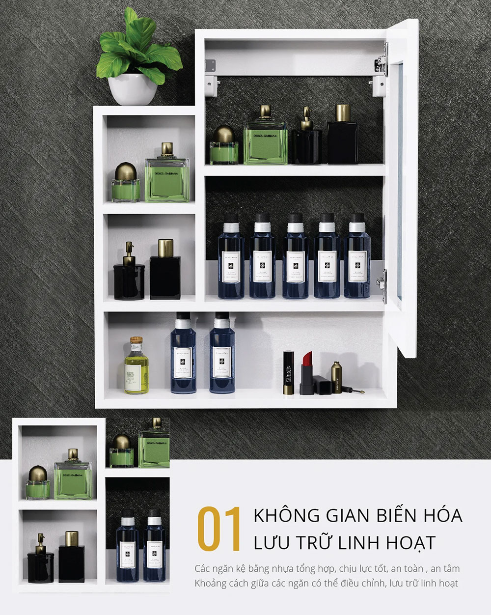 - Bao gồm: bộ tủ gương, bộ cố định