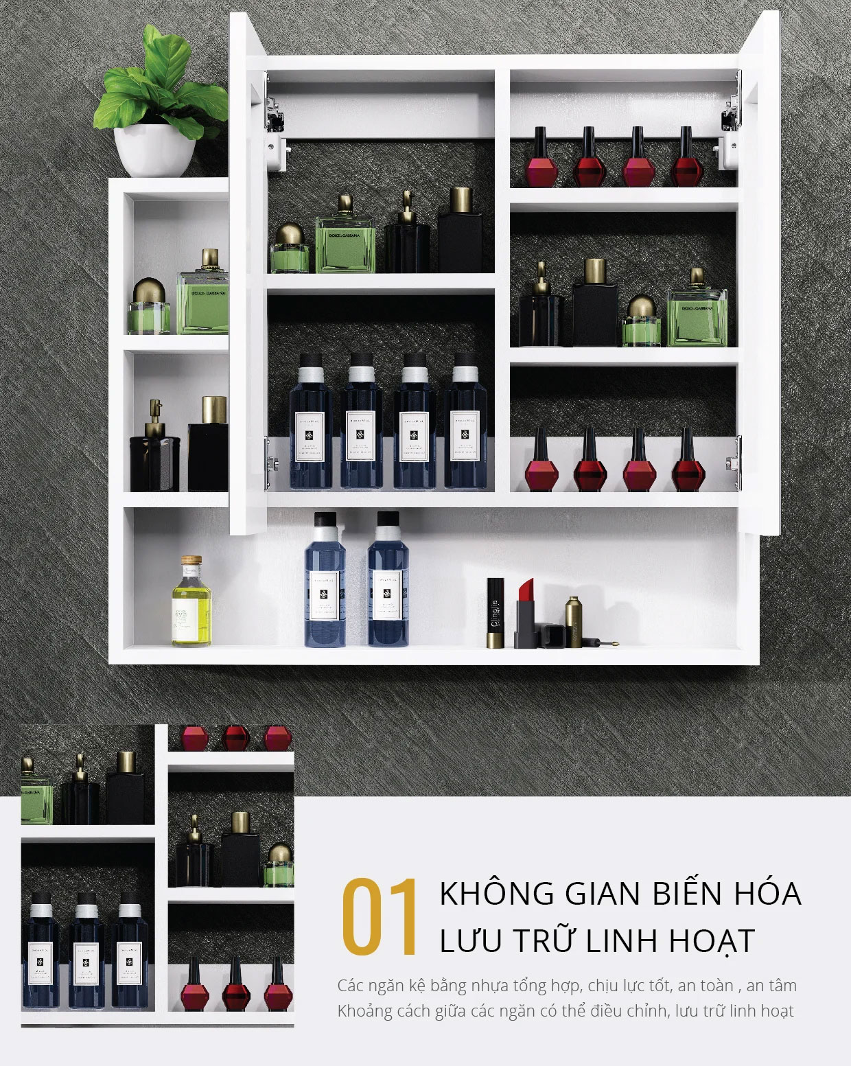 - Bao gồm: bộ tủ gương, bộ cố định