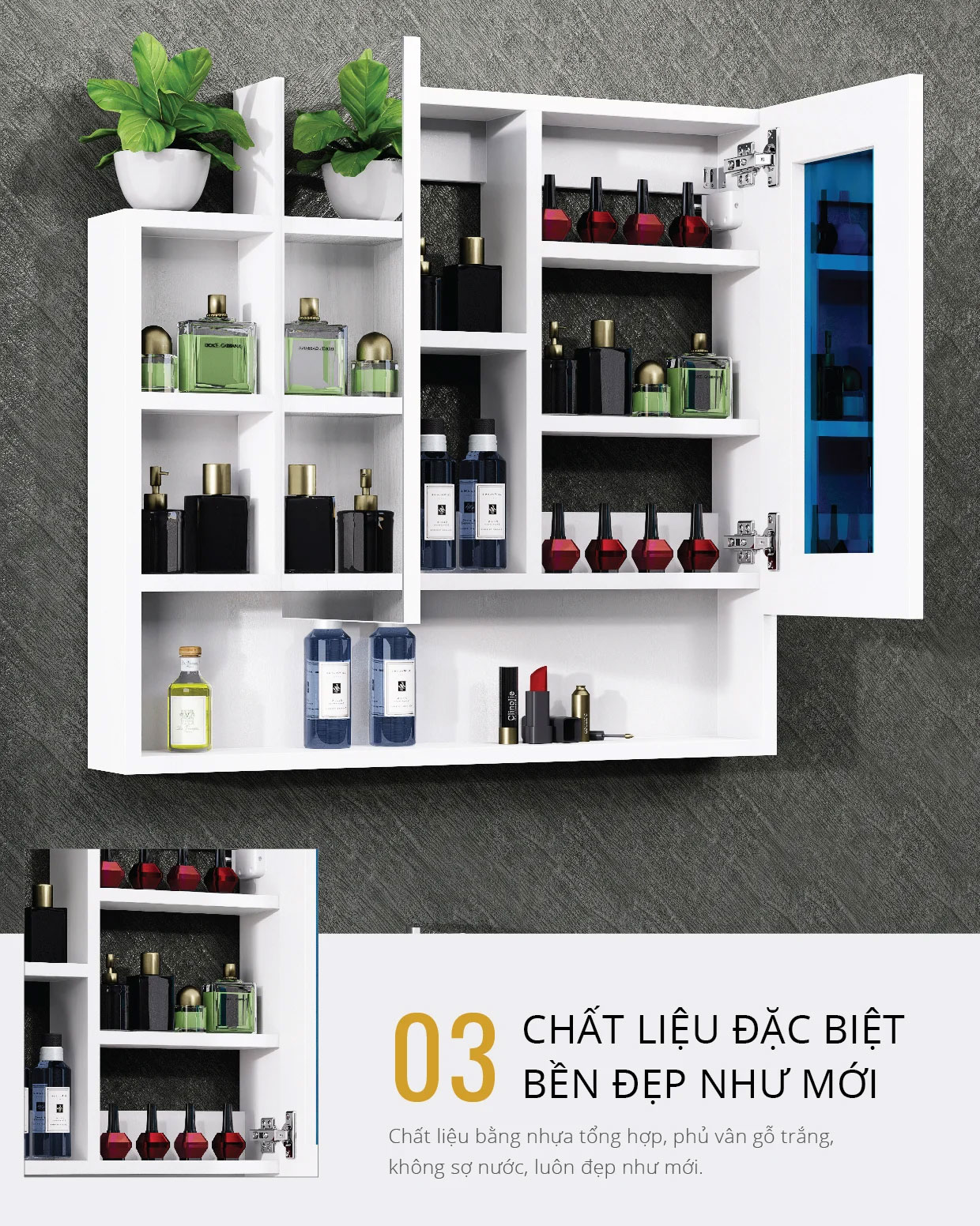 - Chất liệu: ván nhựa PVC (tủ), gương tráng bạc