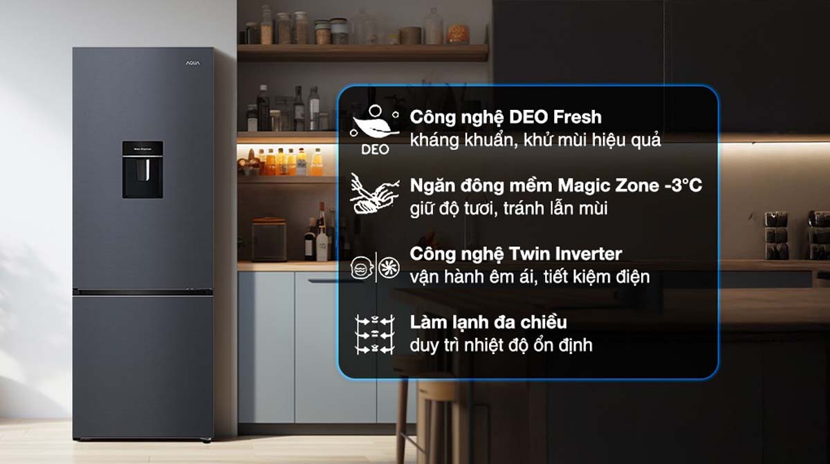 AQR-B360MA(WSL) tích hợp công nghệ DEO Fresh sử dụng phân tử Nano bạc Ag+, giúp loại bỏ mùi hôi khó chịu và hạn chế sự phát triển của vi khuẩn bên trong tủ. Nhờ đó, không khí bên trong luôn sạch sẽ, thực phẩm không bị lẫn mùi và giữ được độ tươi lâu hơn, đảm bảo an toàn vệ sinh cho người sử dụng.