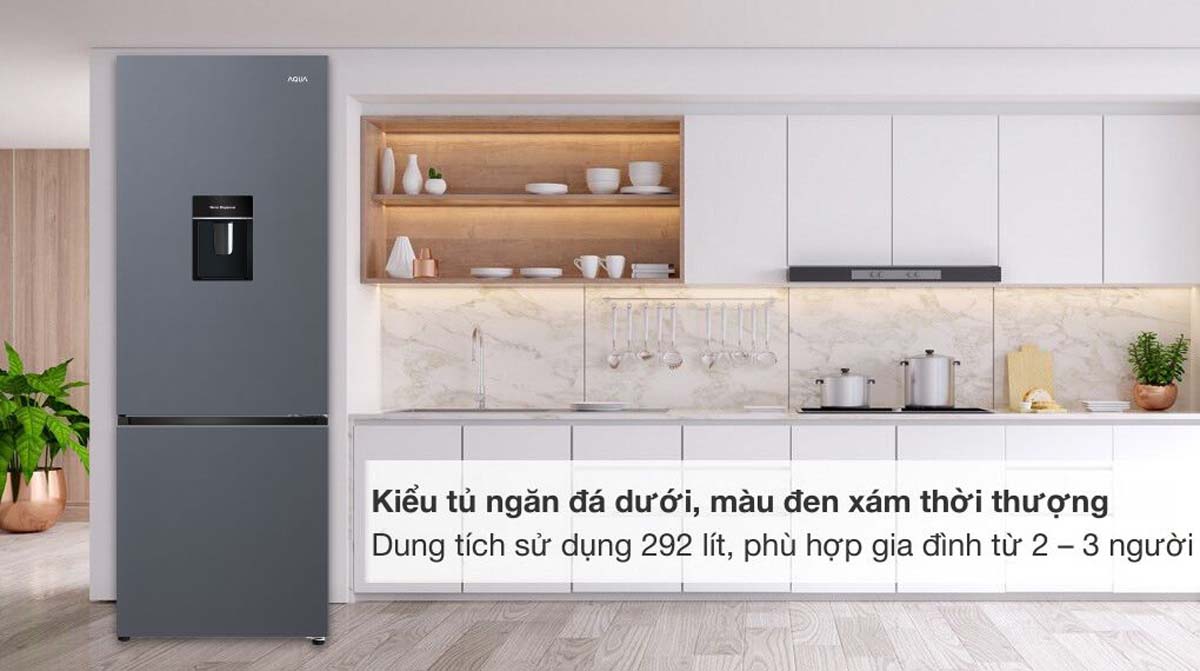 Tủ lạnh Aqua AQR-B360MA(WSL) sở hữu thiết kế ngăn đá dưới tiện lợi với màu xám khói tinh tế, phù hợp với nhiều không gian nội thất. Với dung tích sử dụng 292 lít (ngăn đá 91 lít, ngăn lạnh 167 lít, ngăn đông mềm 34 lít), sản phẩm đáp ứng tốt nhu cầu lưu trữ thực phẩm cho gia đình từ 2 đến 3 người. Kích thước tủ: cao 165 cm, rộng 59.8 cm, sâu 68.1 cm, trọng lượng 61 kg.