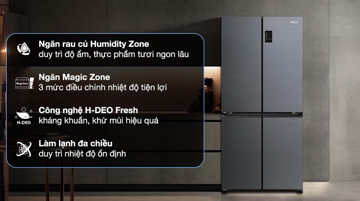 AQR-M536XA(SL) nổi bật với ngăn Magic Zone có thể điều chỉnh nhiệt độ linh hoạt từ -20°C đến 5°C. Ngăn này giúp bảo quản đa dạng thực phẩm như thịt, cá, rau củ và đồ uống một cách tối ưu.