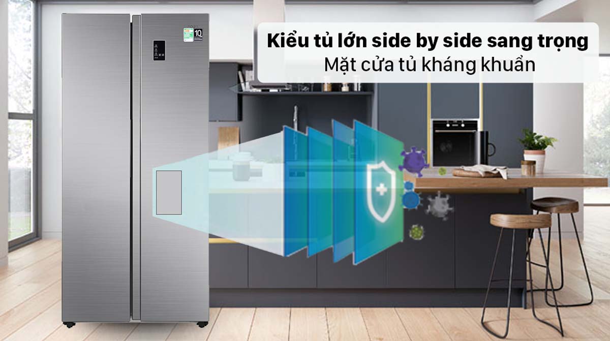 Tủ lạnh Aqua AQR-S480XA(SG) sở hữu thiết kế side by side hiện đại với hai cánh mở rộng, mang đến vẻ ngoài sang trọng và tiện nghi cho không gian bếp. Mặt cửa tủ được làm từ thép kháng khuẩn, giúp hạn chế sự phát triển của vi khuẩn và nấm mốc, đảm bảo an toàn cho thực phẩm và sức khỏe người dùng. Gam màu xám bạc tinh tế cùng bảng điều khiển cảm ứng bên ngoài không chỉ tăng tính thẩm mỹ mà còn thuận tiện trong việc điều chỉnh các chức năng mà không cần mở cửa tủ.