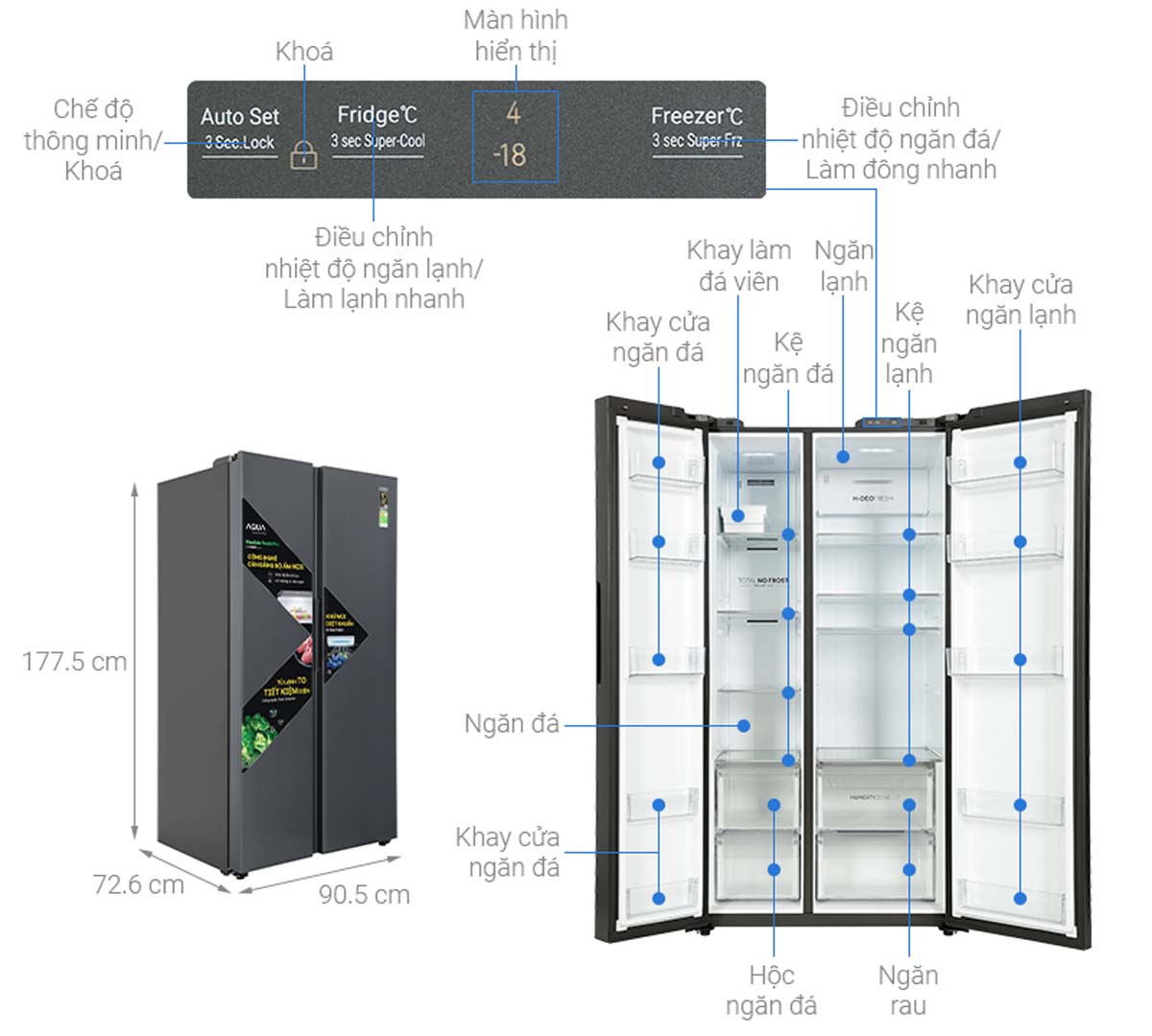 Tủ lạnh Aqua AQR-S682XA(SLB) sở hữu thiết kế Side by Side hiện đại với hai cánh mở rộng, mang đến vẻ ngoài sang trọng và tiện nghi cho không gian bếp. Mặt cửa tủ được làm từ thép không gỉ, giúp hạn chế sự phát triển của vi khuẩn và nấm mốc, đảm bảo an toàn cho thực phẩm và sức khỏe người dùng. Gam màu đen xám tinh tế cùng bảng điều khiển cảm ứng bên ngoài không chỉ tăng tính thẩm mỹ mà còn thuận tiện trong việc điều chỉnh các chức năng mà không cần mở cửa tủ.