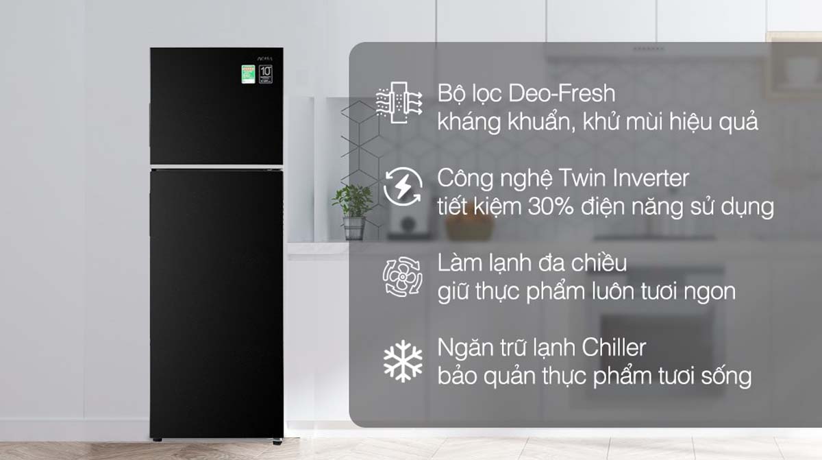 AQR-T299FA(FB) được trang bị công nghệ Twin Inverter, giúp máy nén và quạt hoạt động ổn định, kiểm soát nhiệt độ chính xác và tiết kiệm điện năng tối ưu. Nhờ đó, tủ lạnh vận hành êm ái, giảm tiếng ồn và kéo dài tuổi thọ thiết bị. Công suất tiêu thụ điện năng khoảng 0.84 kWh/ngày.