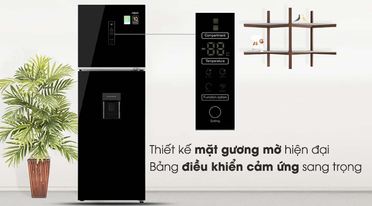 Tủ lạnh Aqua AQR-T389FA(WGB) sở hữu thiết kế hiện đại với mặt gương mờ tinh tế, mang lại vẻ đẹp sang trọng cho không gian bếp. Mặt gương không chỉ tạo điểm nhấn thẩm mỹ mà còn dễ dàng vệ sinh, giữ cho tủ luôn sạch sẽ. Bảng điều khiển cảm ứng được bố trí bên ngoài cửa tủ, cho phép người dùng dễ dàng điều chỉnh các chức năng mà không cần mở cửa, giúp tiết kiệm điện năng và duy trì nhiệt độ ổn định bên trong.