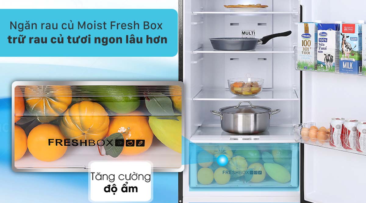 Ngăn rau củ giữ ẩm Moist Fresh Box duy trì độ ẩm lý tưởng để bảo quản rau củ và trái cây tươi ngon lâu hơn. Thiết kế đặc biệt của ngăn này giúp duy trì độ ẩm tối ưu, ngăn ngừa tình trạng khô héo và mất nước ở thực phẩm. Nhờ đó, rau củ và trái cây giữ được độ tươi ngon và giá trị dinh dưỡng trong thời gian dài hơn.