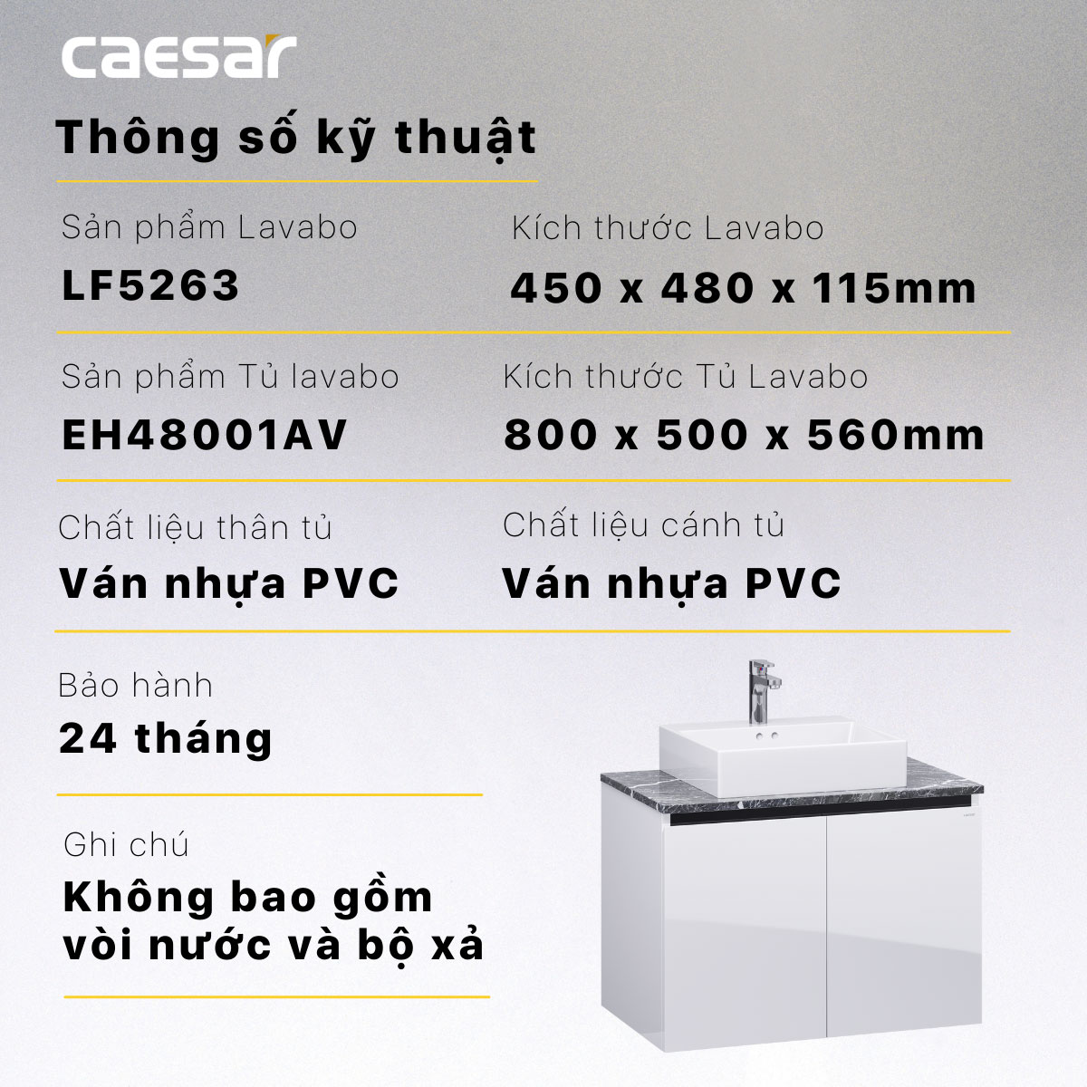 - Không bao gồm: vòi chậu, siphon, bộ xả, chân tủ