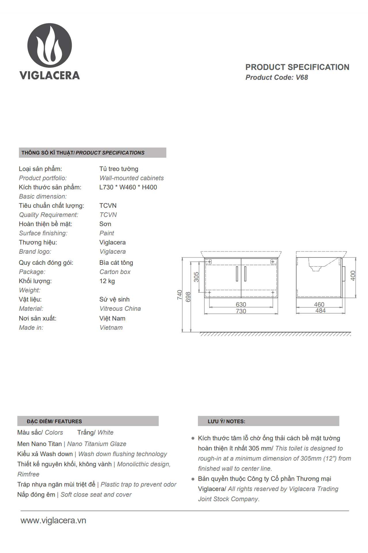 Thông số kĩ thuật Tủ lavabo VIGLACERA V68 Chậu CB68 treo tường
