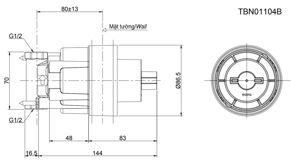 Bản vẽ kỹ thuật Van dừng TOTO TBN01104 B sen âm tường