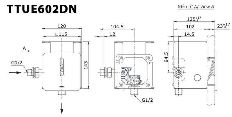 Bản vẽ kĩ thuật Van xả tiểu nam TOTO TTUE602DN cảm ứng dùng pin âm tường